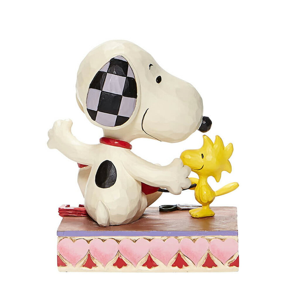 生産地:カンボジア サイズ:本体:W9.2×H11.4×D6.3cm 素材:レジン製 スヌーピーとウッドストックがハートのガーランドを披露している様子が描かれております。